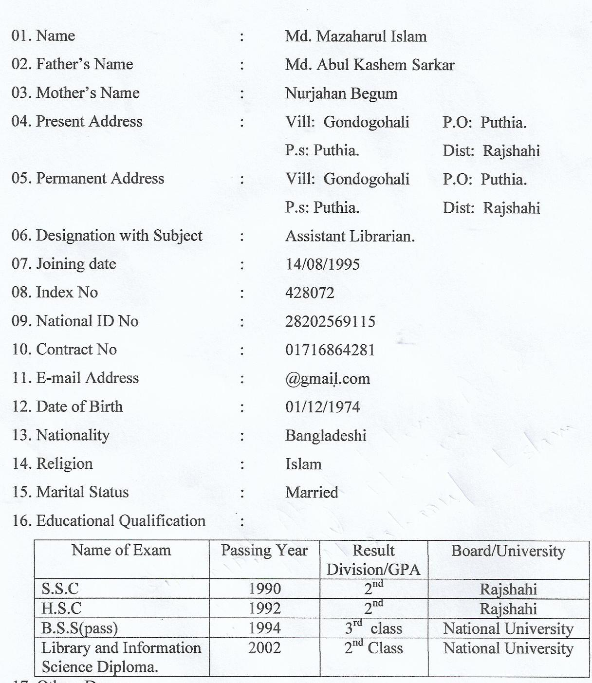 প্রাক্তন প্রতিষ্ঠান প্রধানের তথ্য